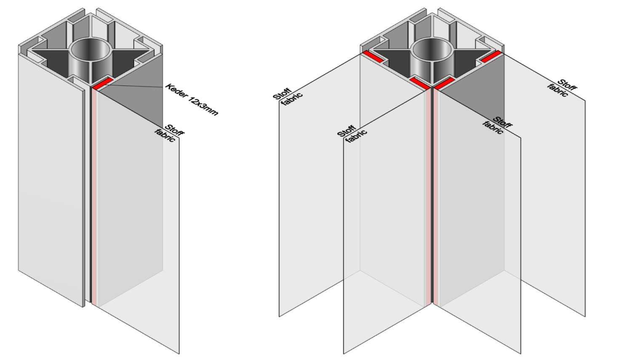 Eine nahtlose Aufnahme von Wanddesigns und Werkstoffen erfolgt in diesen 8 Nuten. Vornehmlich textile, individuell gestaltbare Spanntücher an den Wandscheiben werden mittels eines Keders einfach in die Nuten gesteckt, und sind damit kinderleicht auszu- tauschen, sowie zu reinigen.